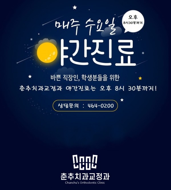 춘추치과교정과는 매일 수요일 마다 야간진료를 오후 8시 30분까지 합니다.